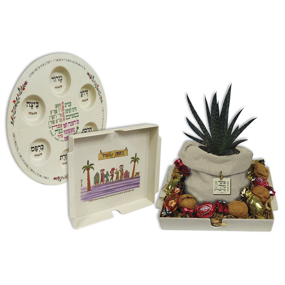 מארז נמרוד לפסח המכיל – צלחת לפסח מבמבוק בשילוב מלמין, מגש למצה מבמבוק בשילוב מלמין, סקולנט בעציץ בטון שק, 6 אגוזי מלך ו-8 פרלינים