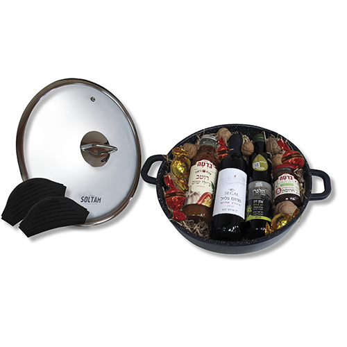 מארז רענן מכיל סוטאז' 28 ס"מ מבית סולתם עם 2 ידיות סיליקון, שמן זית 250 מ"ל, יין 375 מ"ל, רוטב 280 מ"ל, חרוסת 120 גר', 6 פרלינים ו-6 אגוזים