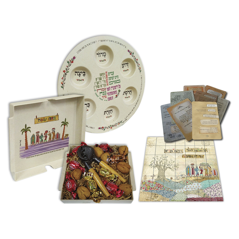 צלחת לפסח מבמבוק בשילוב מלמין, הגדה לפסח בגלויות מעוצבות בגב הגלויות פאזל עם דמויות וציטטות, מגש למצה מבמבוק בשילוב מלמין, מפצח אגוזים, 7 אגוזים ו-8 פרלינים