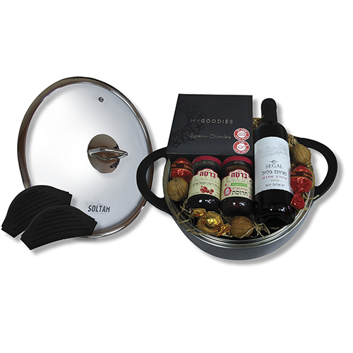 מארז שמלא מכיל סיר 24 ס"מ מבית סולתם, יין 375 מל', חרוסת 120 גר', ממרח מתוק 120 גר', 3 פרלינים ו-3 אגוזים