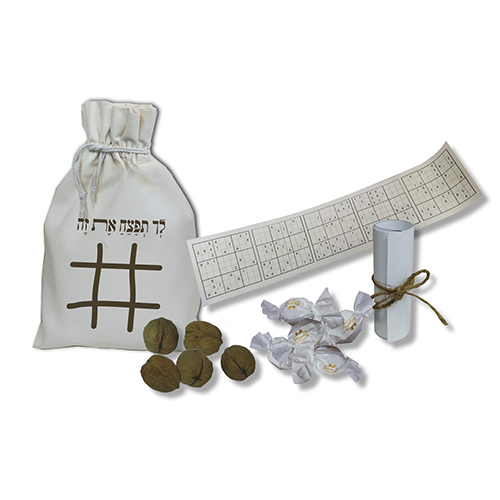 מארז תומר מכיל שקית כותנה עם 5 פרלינים, 5 אגוזים ומשחק סודוקו המורכב מ-5 משחקים