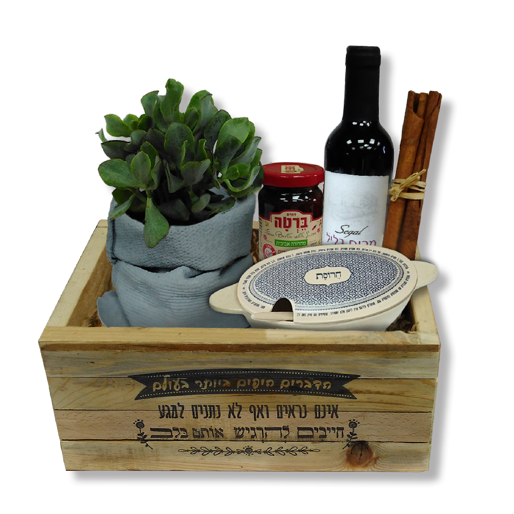 מארז עץ לפסח המכיל יין 375 מל', חרוסת 120 גרם, כלי לחרוסת עם כפית, מקלות קינמון ארוכים ועציץ בטון דמוי שק עם סקולנט