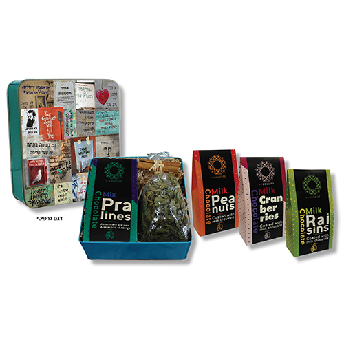 קופסת פח למצות עם מארז שוקולד בטעמים שונים צימוקים/חמוציות/בוטנים/פרלינים בציפוי שוקולד, חליטת צמחים ומקלות קינמון