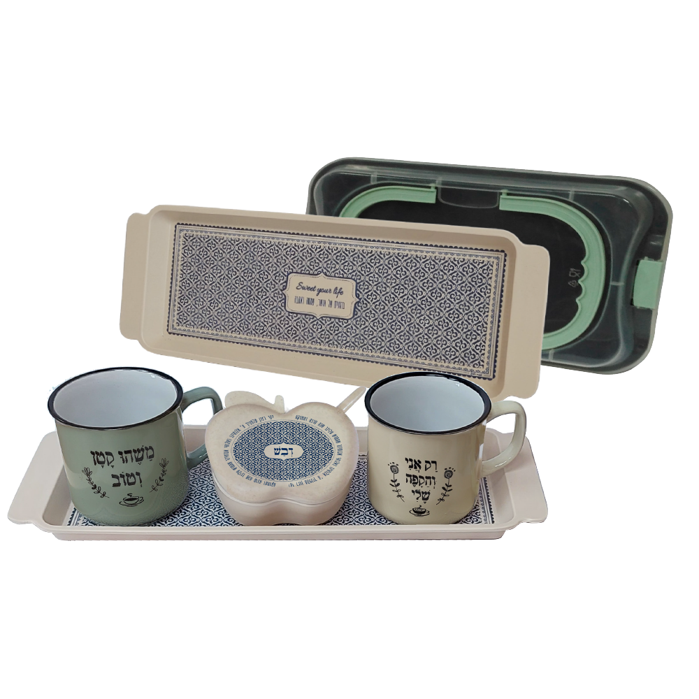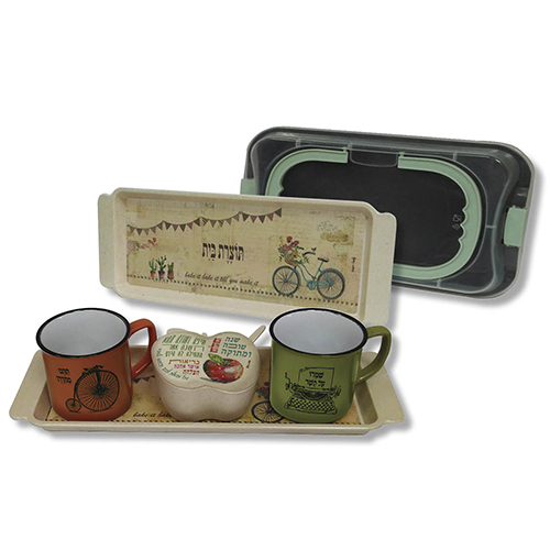 תבנית לעוגה עם מכסה לנשיאה, מגש לעוגה עם כלי לדבש, כפית ו-2 ספלים צבעוניים, כלי לדבש מבמבוק בשילוב מלמין מידה: 11x11x7 ס"מ, מגש מבמבוק בשילוב מלמין מידה: 14.5×39.5 ס"מ, גודל התבנית 36×23.5 ס"מ.