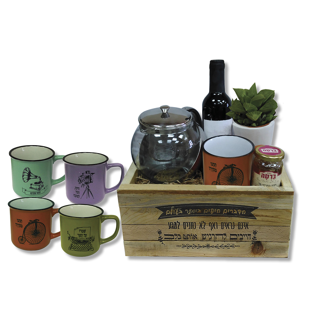 מארז מעץ הכולל: יין (375 מל'), קנקן חליטה, ספל צבעוני, דבש (120 גרם) ועציץ בטון עם "סקולנט".