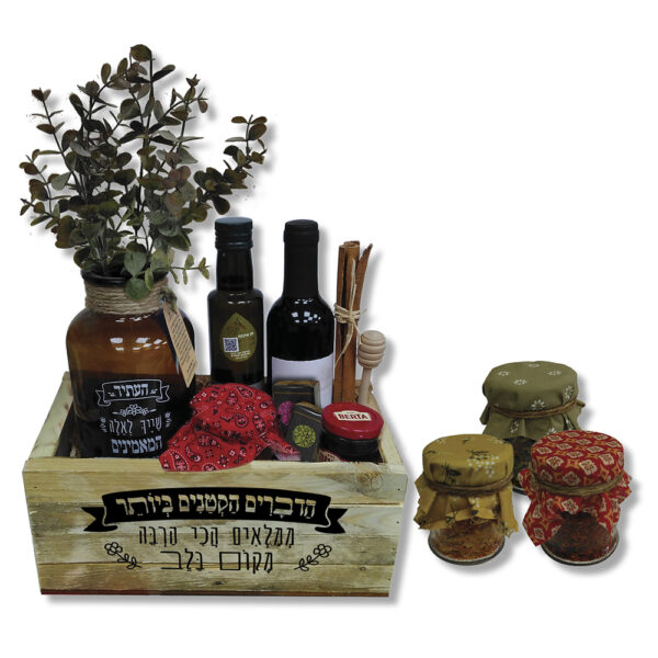 מתנה לראש השנה – מארז חוה מעץ המכיל יין 375 מל', שמן זית 250 מל', אגרטל מזכוכית חומה עם אקליפטוס מלאכותי, תערובת לבישול, דבש 120 גרם, כפית דבש, ו-2 קוביות שקיקי תה מבית סרמוני ומקלות קינמון ארוכים מידת מארז: 30x13x15 ס"מ, תכולת האגרטל 1000 מ"ל