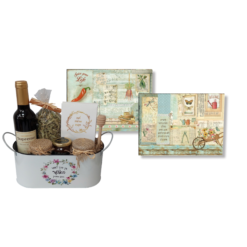 המארז כולל בקבוק יין איכותי (375 מ"ל), מארז ספיר לבן עם בוטן בעיטוף שוקולד לבן עם קרמל מלוח, דבש מובחר 120 גרם, כפית דבש מעוצבת, שתי חליטות פירות, חליטת צמחים ארומטית, מקלות קינמון, וקרש חיתוך מזכוכית (35×25 ס"מ).