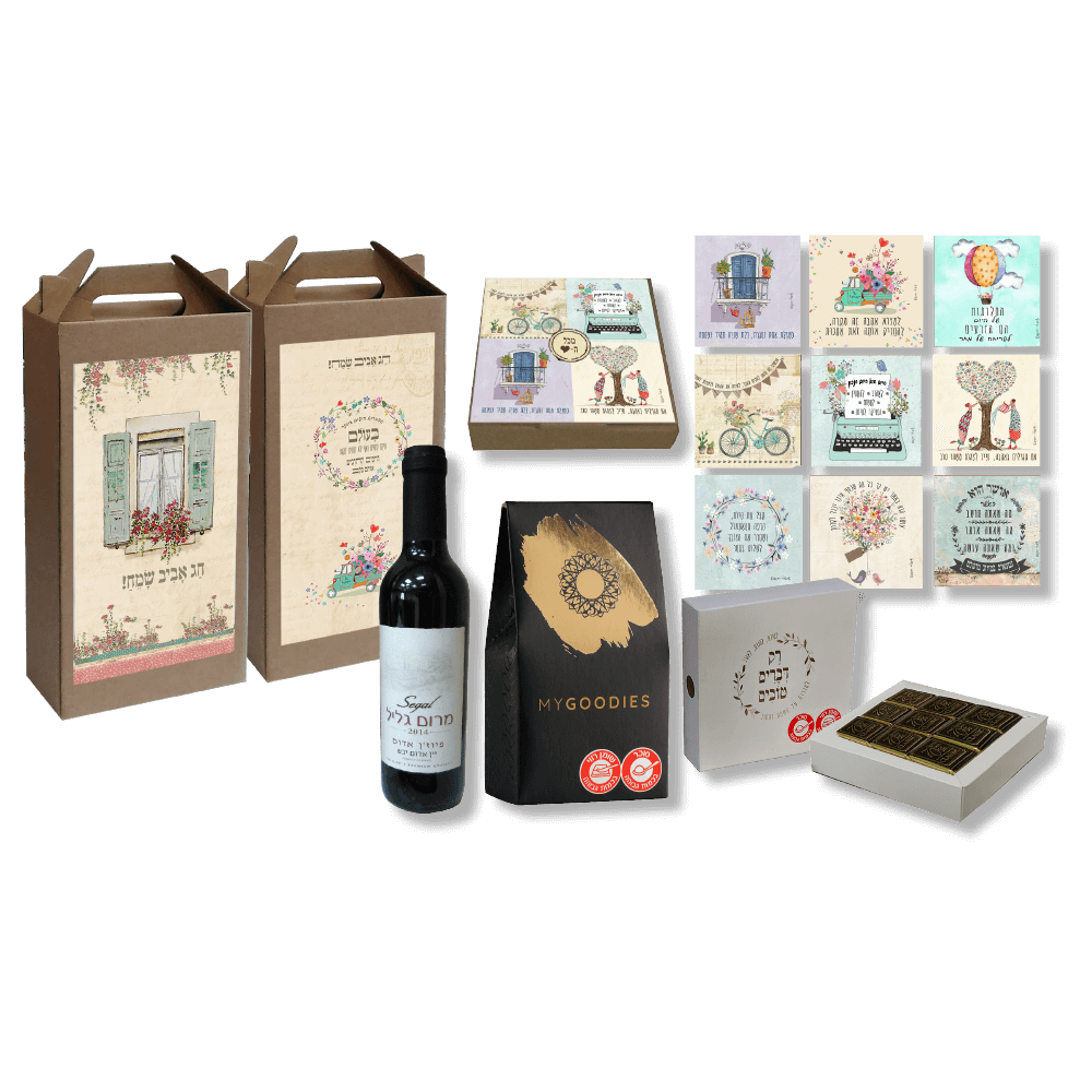מארז מעוצב עם יין 375 מ"ל, מארז נפוליטנים משוקולד מריר 70%, מריר, שוקולד בטעמים שונים: צימוקים חמוציות בוטנים בציפוי שוקולד פרלינים ומארז מגנטים דגם זיכרונות שוקולדים 70 גרם, מארזי השוקולד בהתאם לקיים במלאי מידת המארז מגנטים 8×8 ס"מ, מידת המגנטים 6×6 ס"מ