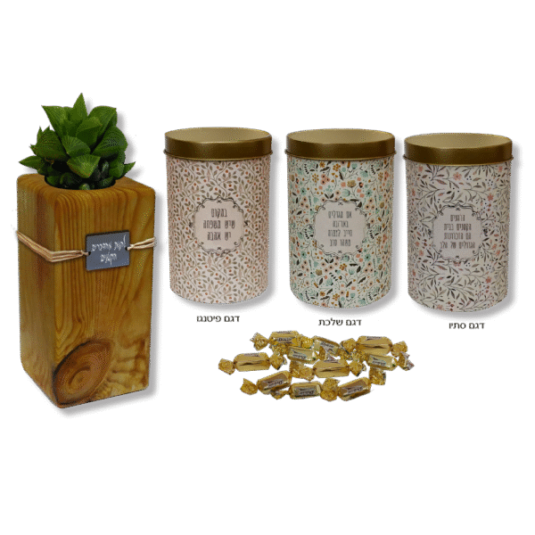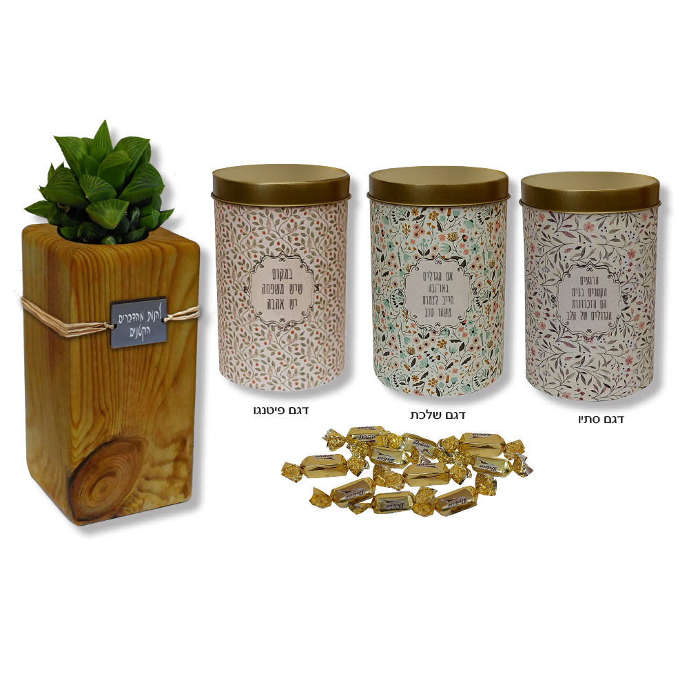 שילוב מדויק בין עיצוב טבעי למתנה מתוקה: פחית עם 10 פרלינים איכותיים וסקולנט מלאכותי בעציץ עץ בגימור טבעי (מידה: 20×10 ס"מ).