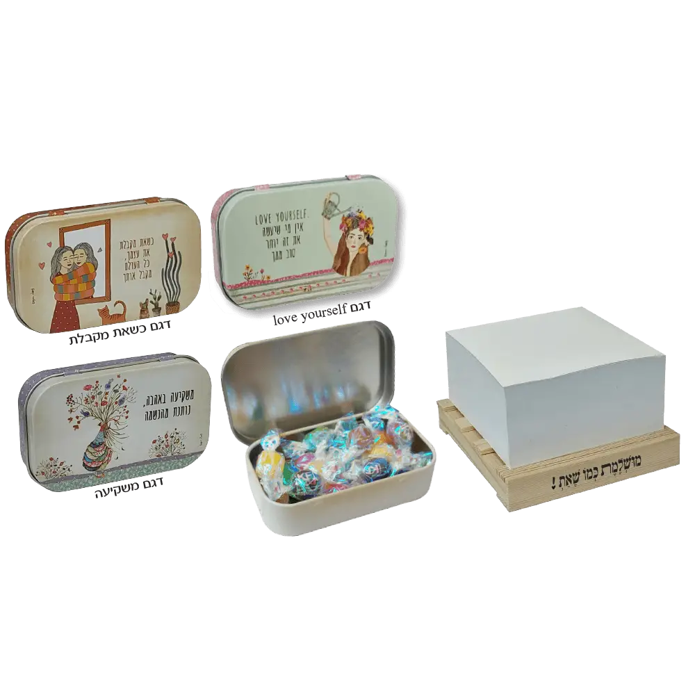 מארז מתוק ומעוצב הכולל קופסת פח עם כ-13 סוכריות יהלום צבעוניות לצד מעמד עץ לנייר ממו. מתנה למורה שמשלבת הנאה מתוקה עם פרקטיות יומיומית.