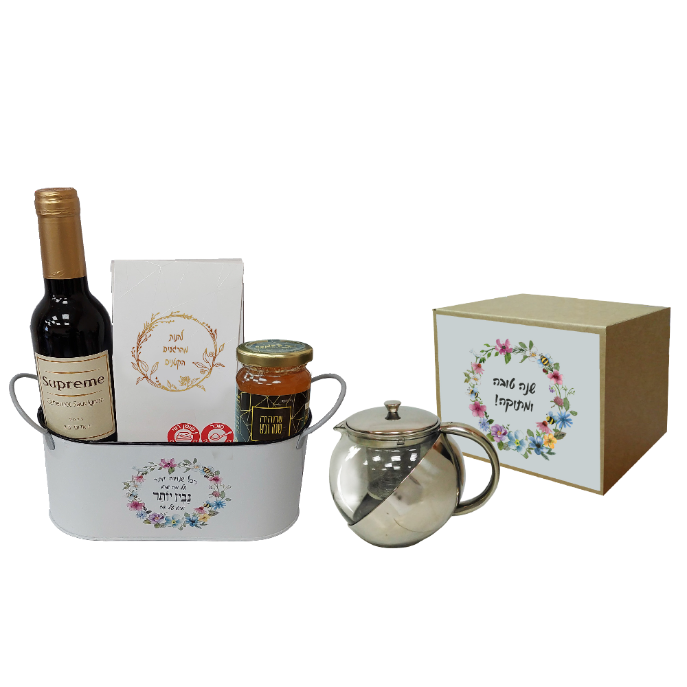 מארז מתוק ומרשים במיוחד, אידיאלי כמתנה לראש השנה לעובדים. המארז כולל בקבוק יין (375 מ"ל), קופסת שוקולד "ספיר לבן" עם בוטן בעיטוף שוקולד לבן עם קרמל מלוח, דבש מובחר במשקל 120 גרם, וקנקן זכוכית לחליטות (תכולה: 1.1 ליטר).
