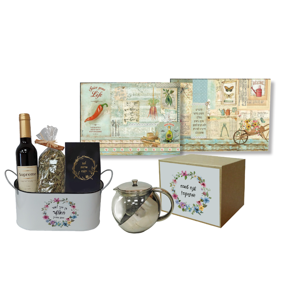 המארז כולל יין משובח (375 מ"ל), קופסת שוקולד פרימיום מסוג ספיר (צימוק בעיטוף שוקולד לבן), חליטת צמחים איכותית, מקלות קינמון, קנקן זכוכית (1.1 ליטר), וקרש חיתוך מזכוכית בגודל 35×25 ס"מ.