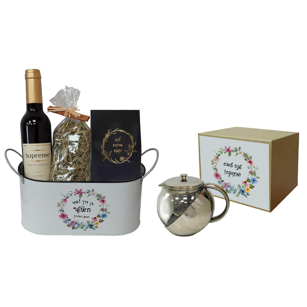 המארז כולל בקבוק יין איכותי (375 מ"ל), קופסת שוקולד ספיר שחורה עם צימוק בעיטוף שוקולד לבן, חליטת צמחים מפנקת, מקלות קינמון לקישוט וניחוח חורפי, וכל זה יחד עם קנקן חליטה מזכוכית (1.1 ליטר) לשימוש יום-יומי.