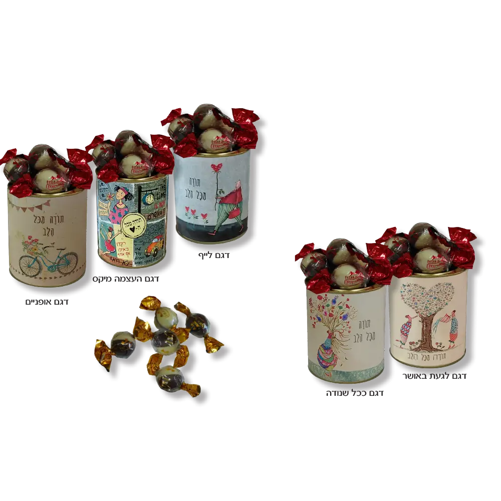 קופסת פח מעוצבת בגודל 8×7.5 ס"מ, עם 5 פרלינים איכותיים. מגיעה עם אפשרות לאריזה בצלופן (בתוספת 2 ש"ח) ועיצובים מעוררי השראה: לגעת באושר, לייף, ככל שנודה, העצמה מיקס, אופניים.