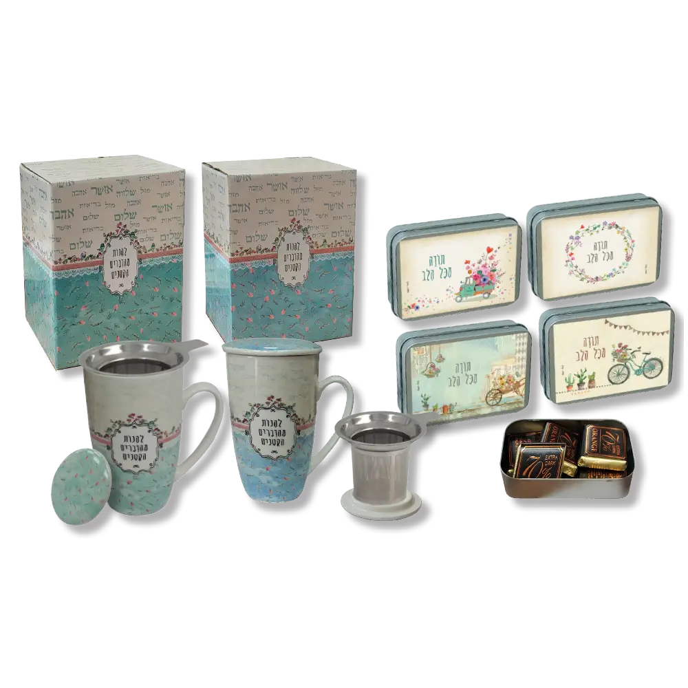 ספל מעוצב עם דיפיוזר לחליטת תה ותכולה של 480 מ"ל, יחד עם קופסת פח המכילה 8 נפוליטנים משוקולד איכותי בטעמים עשירים.