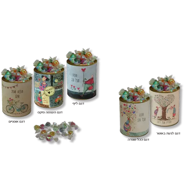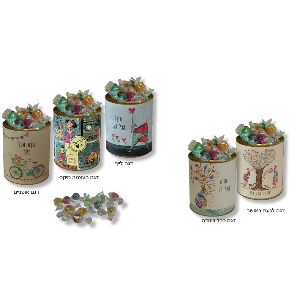 קופסת פח מהודרת בגודל 8×7.5 ס"מ, מלאה ב-25 סוכריות יהלום מבריקות, בטעמים מרעננים. מגיעה במבחר עיצובים מרוממים כמו לגעת באושר, ככל שנודה, לייף, אופניים, העצמה מיקס.