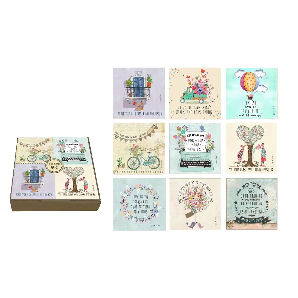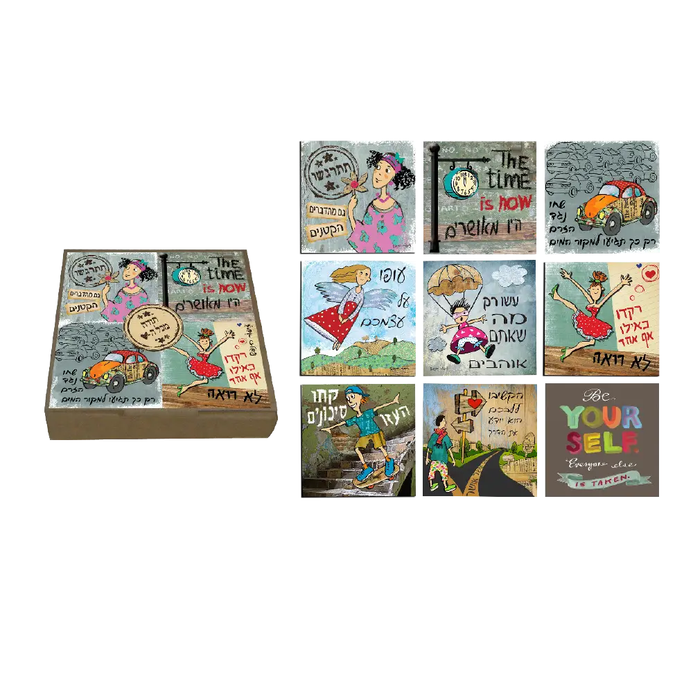 ערכת מתנה ייחודית הכוללת 9 מגנטים מעוצבים, כל אחד עם מסר חיובי אחר. מגנטים בגודל 6×6 ס"מ, באריזה קומפקטית ואלגנטית בגודל 8×8 ס"מ.