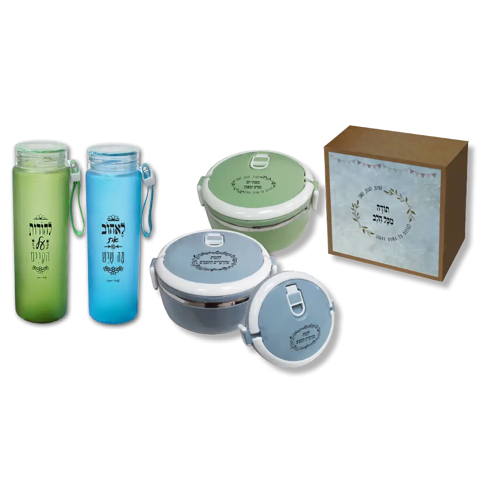 מארז איכותי הכולל קופסת אוכל תרמית שומרת חום/קור עם דופן נירוסטה פנימית, יחד עם בקבוק זכוכית מעוצב בנפח 400 מ"ל – שילוב מנצח בין בריאות, פרקטיות וסטייל.