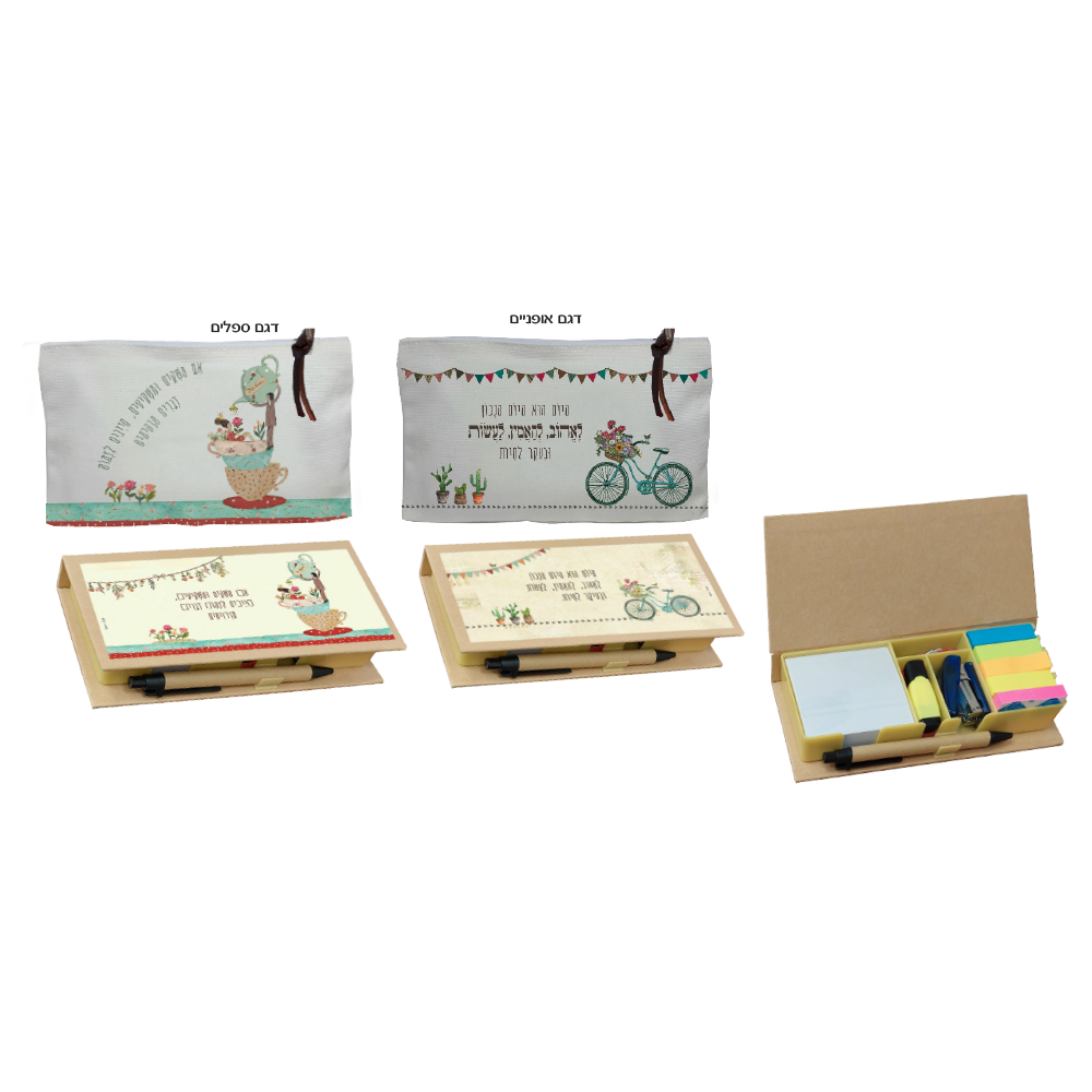 מארז פרקטי הכולל נרתיק איכותי בגודל 20.5×12.5 ס”מ לצד אורגנייזר שולחני בגודל 19.5×9.5 ס”מ. האורגנייזר כולל דפי ממו, עט, מרקר, שדכן, סיכות מהדק ודבקיות – ערכה שלמה לעבודה מסודרת ונעימה.