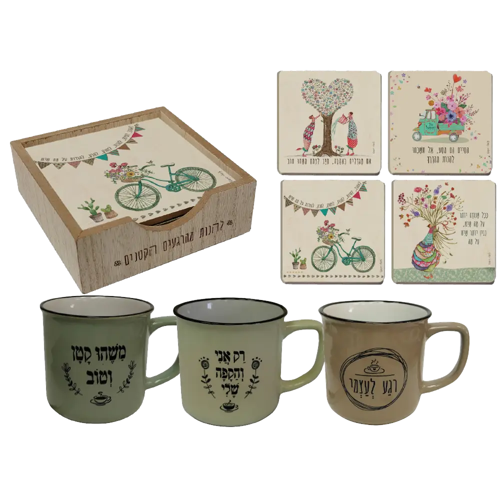 סטנד מעוצב עם 4 תחתיות מעץ לכוסות (10×10 ס"מ) וספל וינטג' מקסים לשתייה חמה. פתרון מושלם לפינת תה אישית – מתאים לעובדים שאוהבים רגעים של שקט בעבודה. מתנה לחנוכה עם טאצ' של ניחוח נוסטלגי.