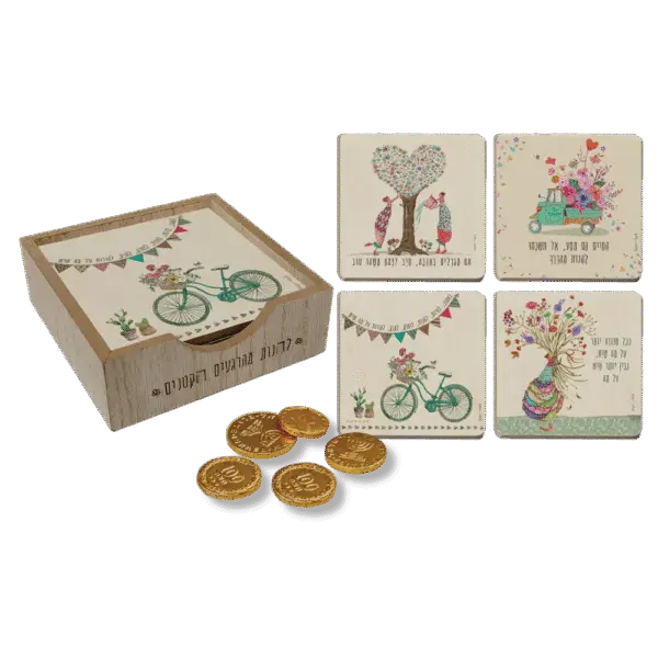 סטנד עץ מעוצב עם 4 תחתיות עץ בגודל 10×10 ס"מ, בשילוב 5 מטבעות שוקולד איכותיים באריזה אלגנטית.
