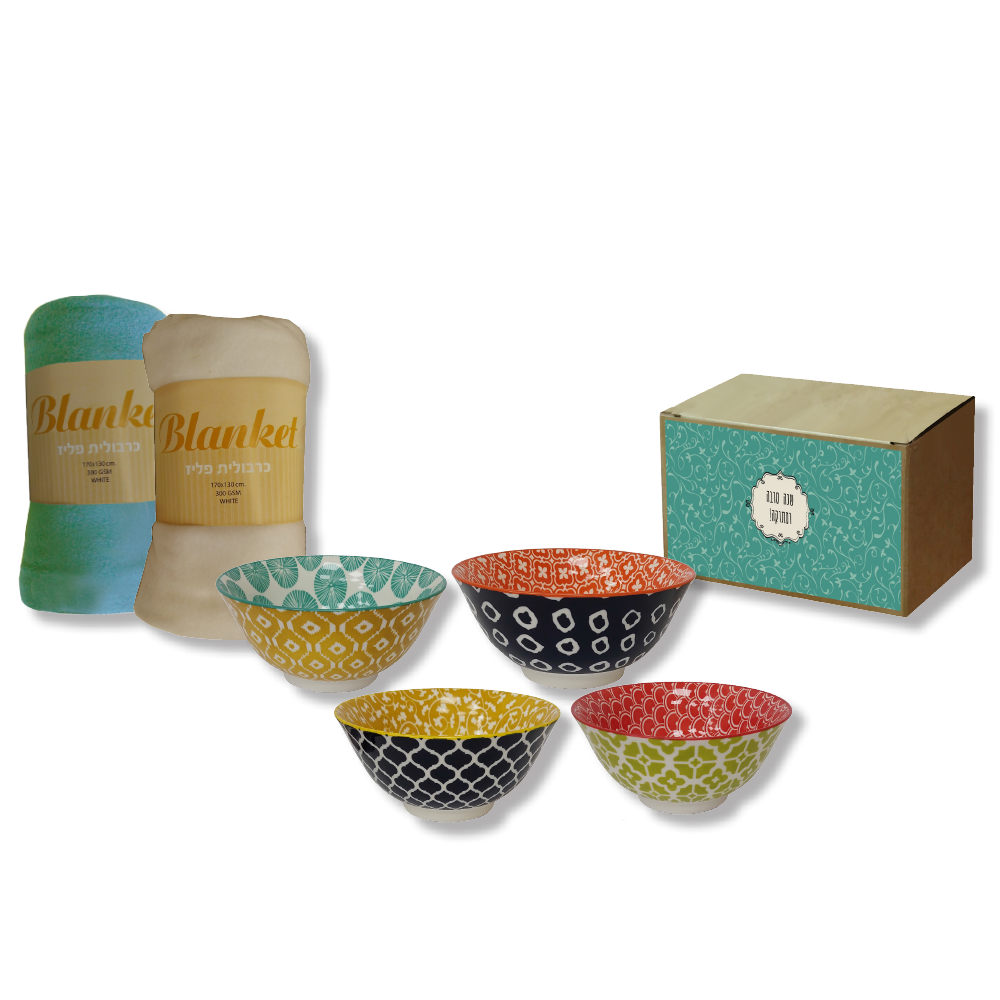 קערת קרמיקה צבעונית בגודל 15.5×7 ס"מ המגיעה עם שמיכת פליז מפנקת בגודל 130×170 ס"מ. שילוב שמביא חמימות וסטייל – מתנה לעובד לראש השנה עם נגיעה אישית.