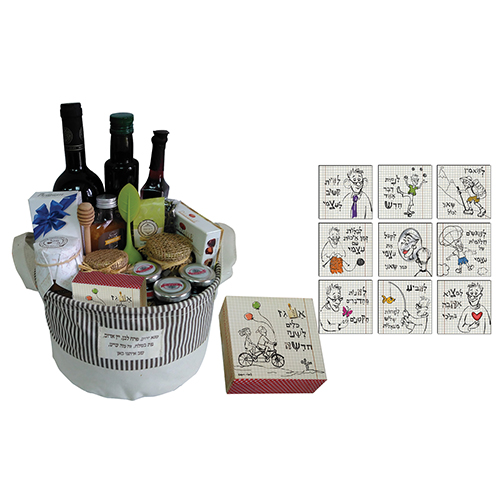 סלסלה עם יין 750 מל', שמן זית 250 מל', ליקר רימון 100 מל', 3 ממרחים מתוקים 30 גרם, דבש בבקבוק ליקר 130 מל', ממרח עגבניות, 2 חליטות פירות בצנצנת, כפית חליטה, כפית לדבש, שוקולד בלגי, חליטת צמחים, מיני בונבוניירה, קופסא עם 9 מגנטים מעוצבים (סלסלה 15×24 ס"מ, קופסת מגנטים 8X8 ס"מ, מגנטים 6X6 ס"מ, ממרחים מתוקים לפי הקיים במלאי)
