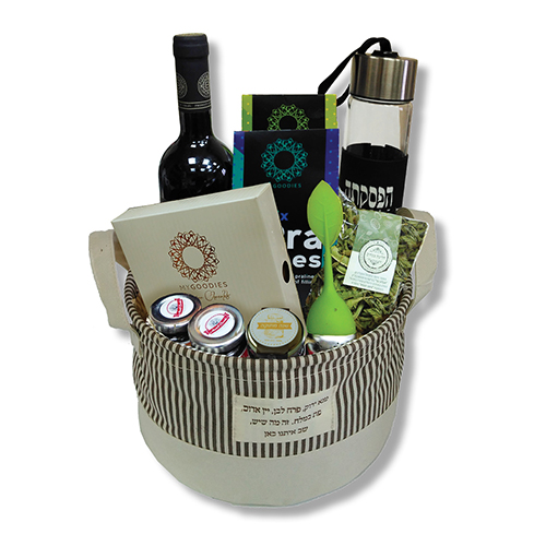 סלסלה עם יין 750 מל', בקבוק חליטה, חליטת צמחים, כפית חליטה, 2 מארזי שוקולד בטעמים שונים: צימוקים/חמוציות/בוטנים בציפוי שוקולד/פרלינים, מארז נפוליטנים משוקולד מריר 70% מריר/אגוז/תפוז, דבשית ו-2 ממרחים מתוקים גודל סלסלה 15×24 ס"מ, מידת הבקבוק 23×5.5 ס"מ, שוקולדים 70 גרם, חליטה, ממרחים מתוקים 30 גר' בהתאם לקיים במלאי