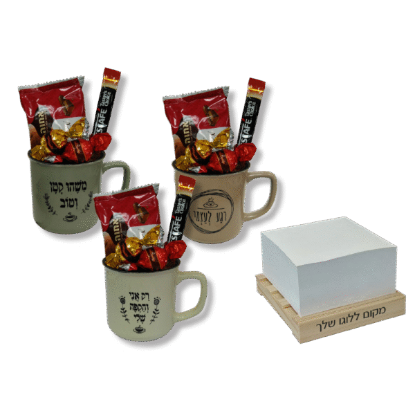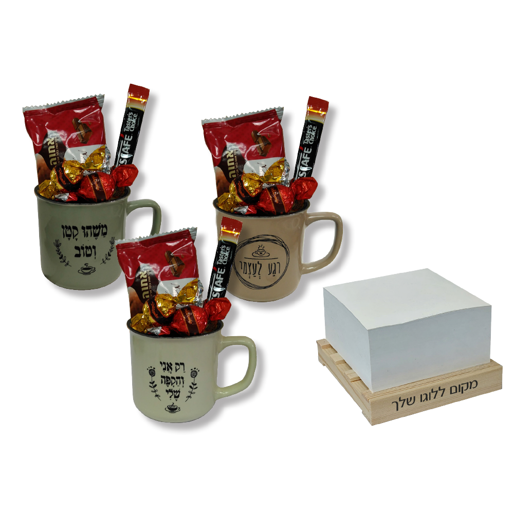 מארז אישי ונעים הכולל ספל מעוצב עם שקית קפה טסטר צ'ויס אישית, שלושה פרלינים מפנקים, מאפין ומעמד עץ לנייר ממו.