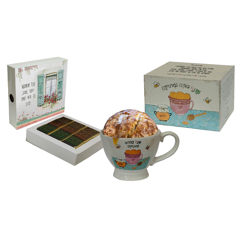 מתנה לראש השנה שמשלבת בין מתיקות חגיגית לאלגנטיות – ספל לעוגת דבש אישית לצד מארז של נפוליטנים משוקולד מריר 70%.
