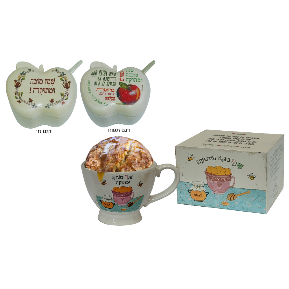 המארז כולל ספל לעוגת דבש אישית, כלי לדבש מעוצב מבמבוק בשילוב מלמין, וכפית תואמת.