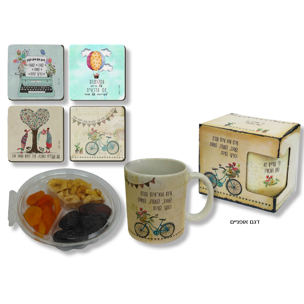 ספל במארז מעוצב עם מגש פירות יבשים 300 גר' ו-4 תחתיות לכוסות מידת התחתיות 9×9 ס"מ, התחתיות עשויות מקרטון קשיח בציפוי למינציה
