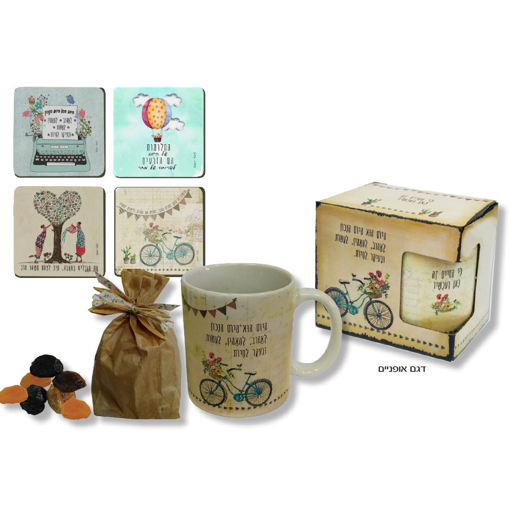 ספל במארז מעוצב, 4 תחתיות לכוסות ו-100 גרם פירות יבשים
