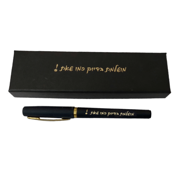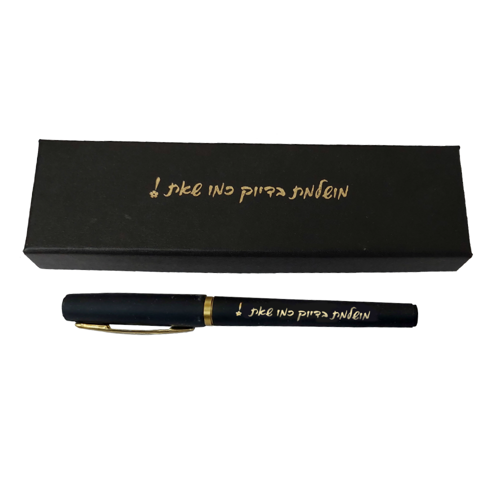 עט שחור בגימור מוזהב, כולל כיתוב והאריזה כפי שמופיעה בתמונה