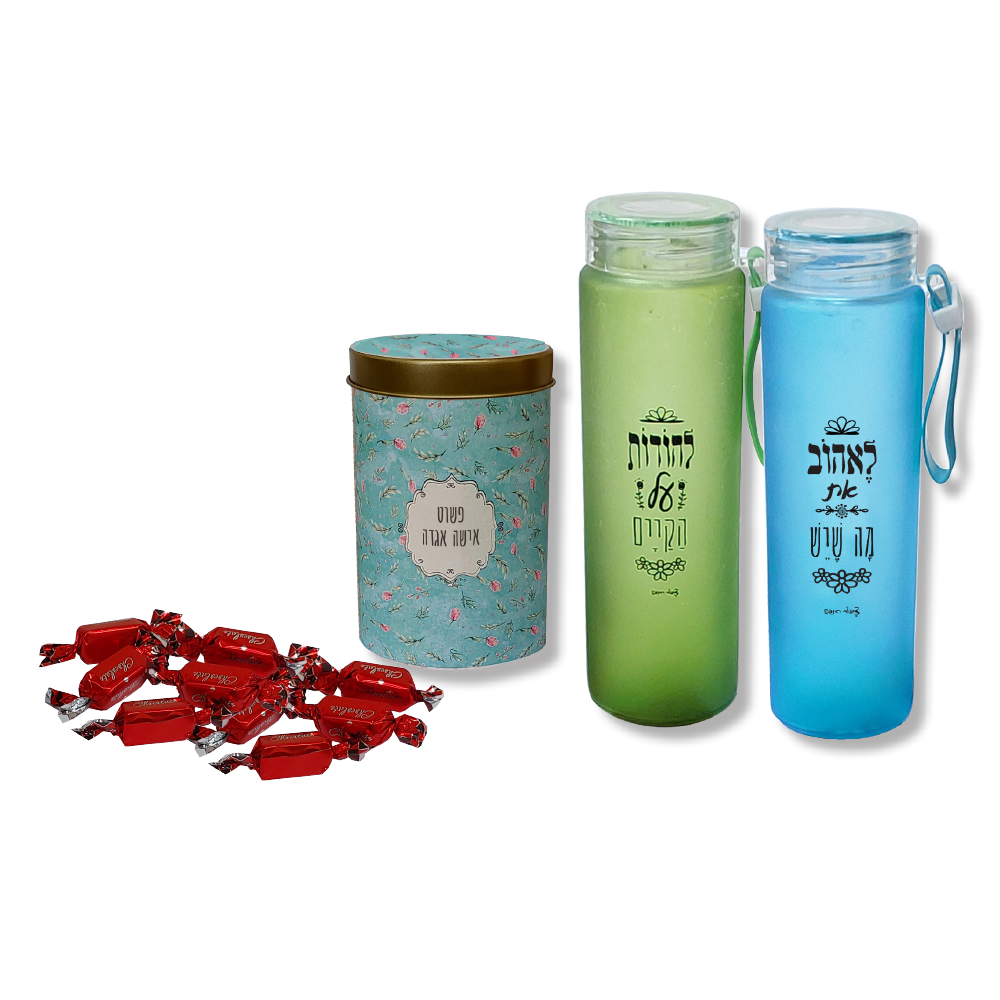 פחית מעוצבת המכילה 10 פרלינים שוקולדיים איכותיים יחד עם בקבוק שתייה מזכוכית בעיצוב אלגנטי בנפח 400 מ”ל. מתנה שמשלבת פרקטיות ומתיקות, מושלמת לנשים מיוחדות ביום האישה.