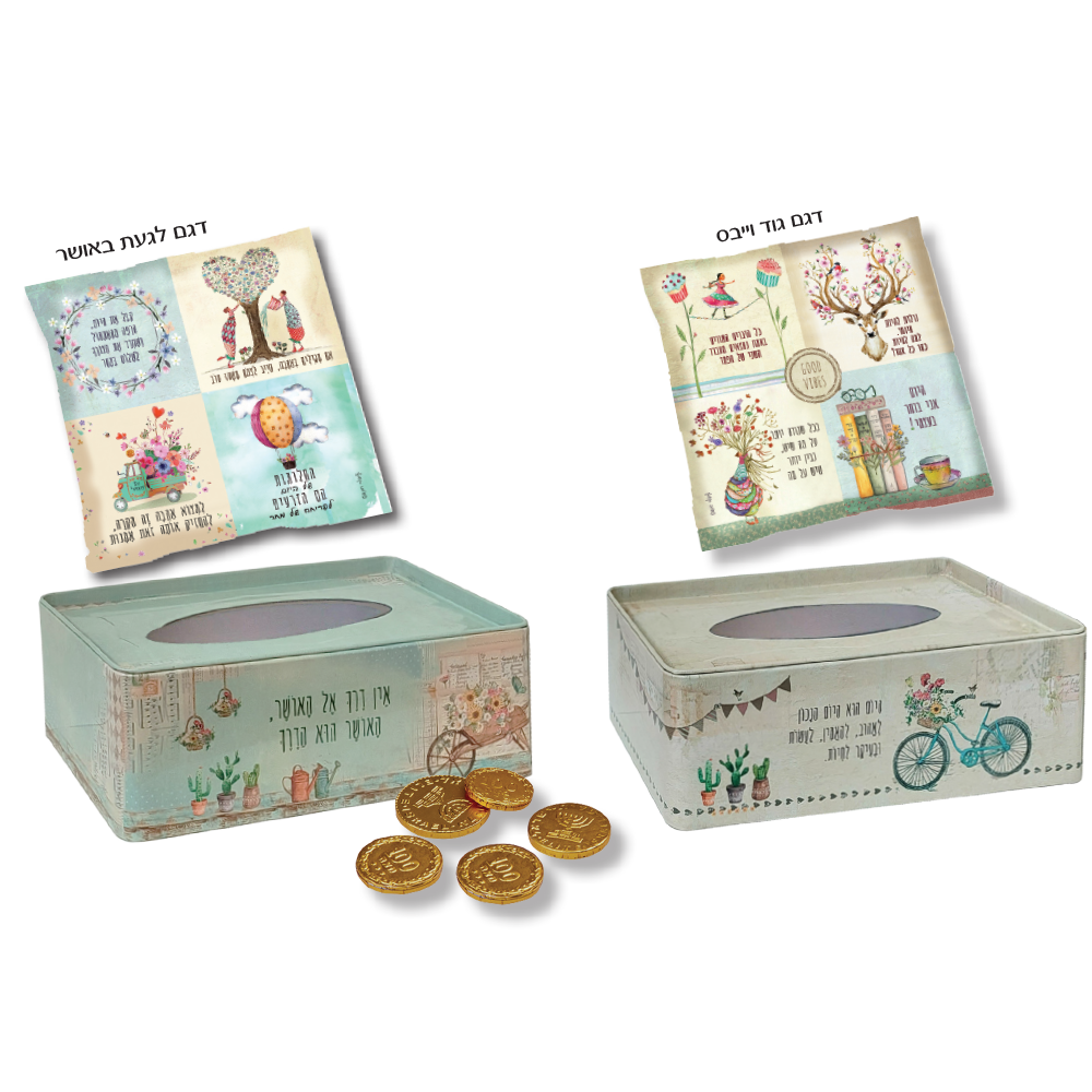 פרטים טכניים: • קופסה לטישו • כרית חימום בגודל 19×19 ס"מ • 5 מטבעות שוקולד • גודל הקופסה: 21.5×11.5×7 ס"מ • דגמים: לגעת באושר, גוד וייבס