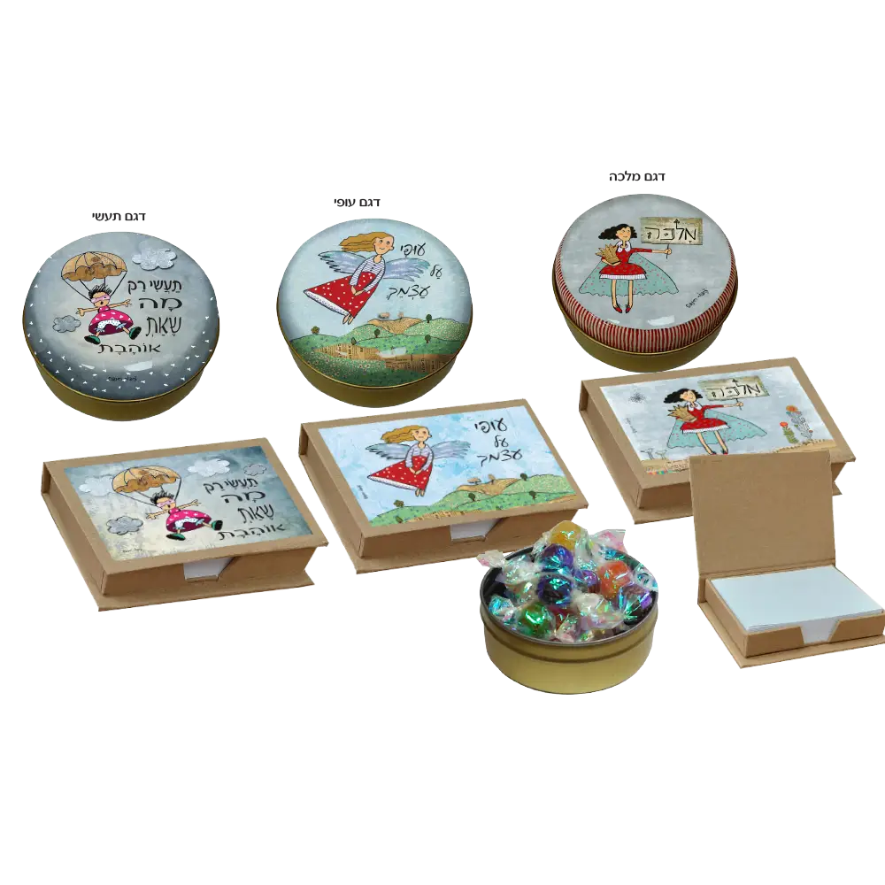 קופסת פח קומפקטית ואלגנטית עם כ-15 סוכריות יהלום צבעוניות, וסטנד עם דפי ממו בגודל 12×8.5 ס"מ.