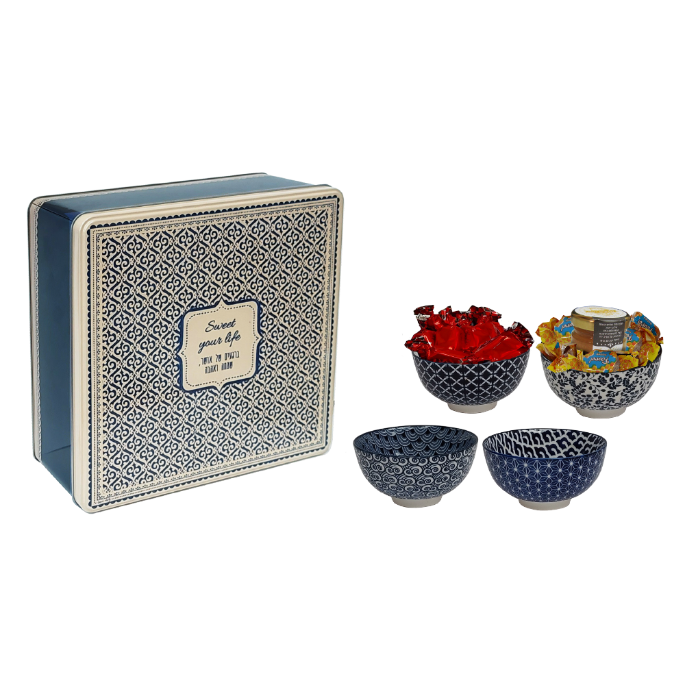 מארז חגיגי ועשיר שכולל את כל מה שצריך כדי לפתוח את השנה בטעם טוב: קופסת פח מהודרת, שתי קעריות קרמיקה מעוצבות, דבשית 30 גרם, 11 סוכריות דבש ו-8 פרלינים איכותיים.