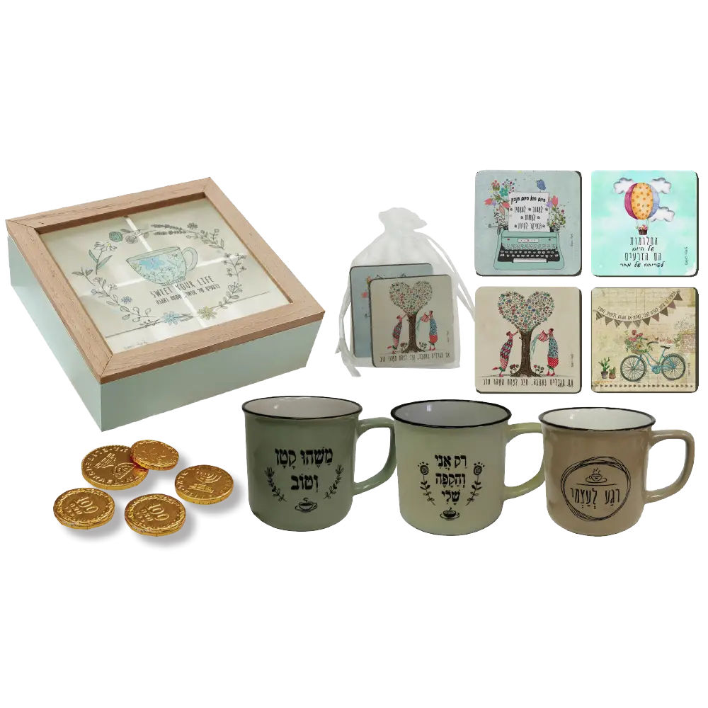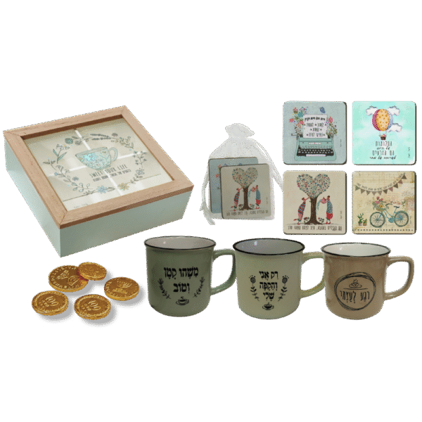 קופסת עץ יוקרתית הכוללת שני ספלי וינטג’, תחתיות מעוצבות לכוסות ו-5 מטבעות שוקולד. מתנה שמשלבת נוחות, שימושיות ויוקרה – מתנה מושלמת לעובדים או ללקוחות.