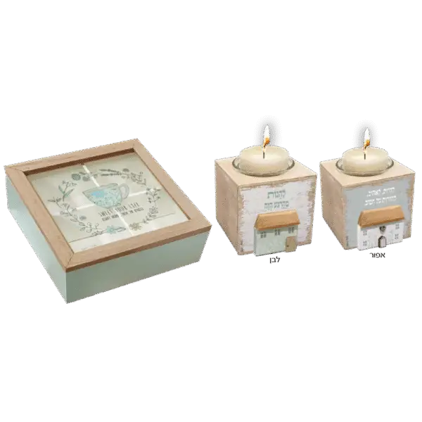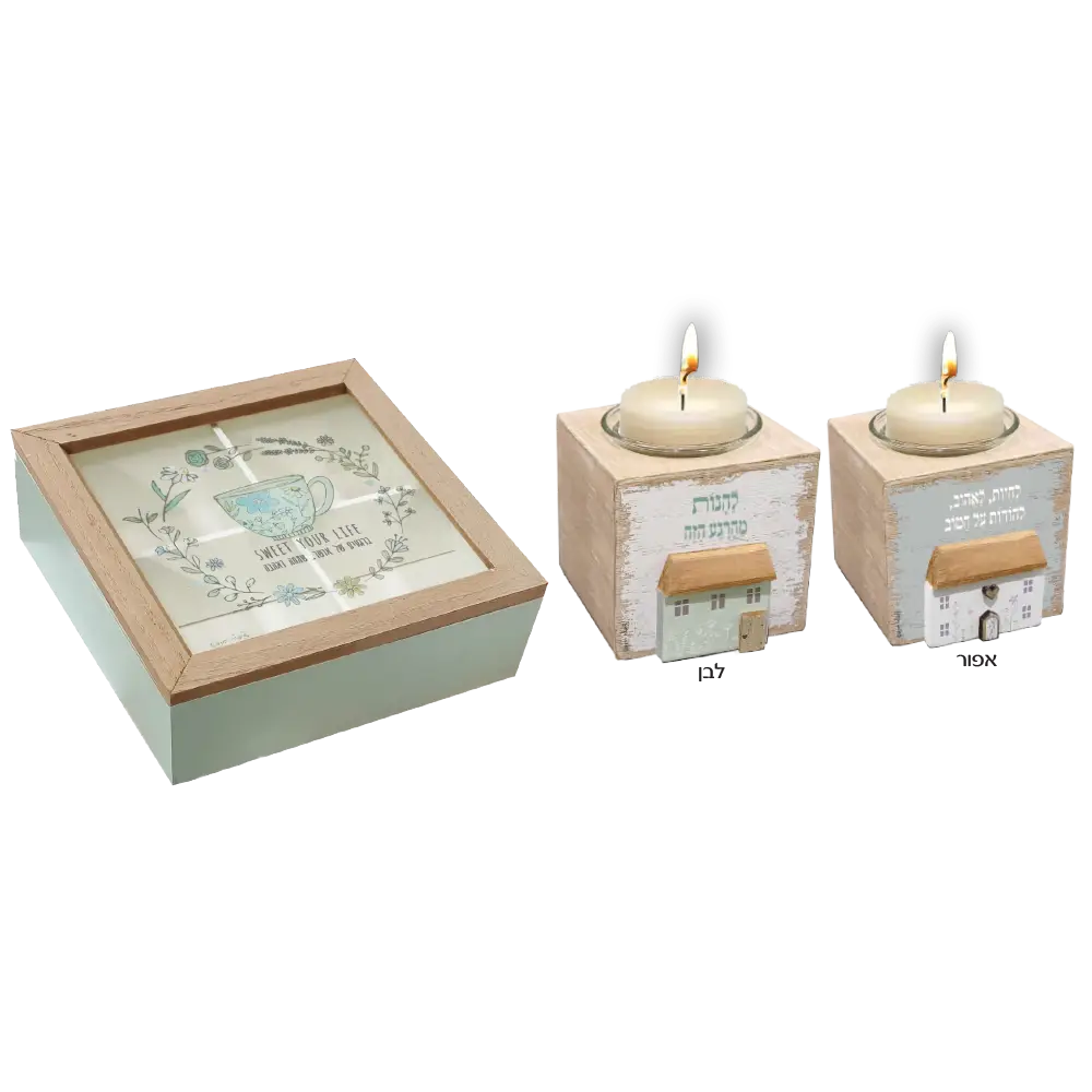 מתנה בעיצוב אלגנטי הכוללת קופסת תה מעץ בגודל 20x20x7 ס"מ וסטנד לנר (8x8x8 ס"מ). שילוב עדין של פרקטיות ואווירה חמימה – קלאסי כשי לאירועים, סוף שנה או חגים.