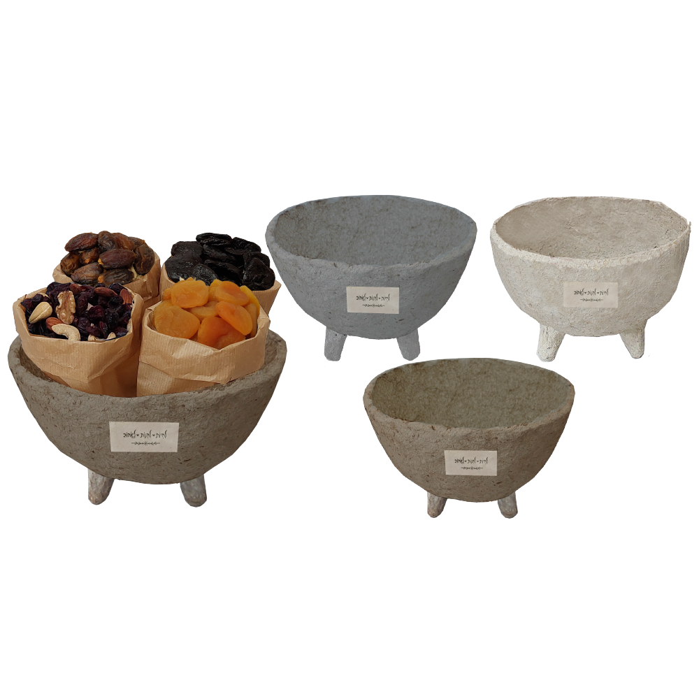 קערה ממוחזרת בגודל 22 ס"מ עם 4 שקיות נייר. המארז כולל: 100 גרם תמרים, 100 גרם משמשים, 100 גרם שזיפים ו-100 גרם מיקס בריאות – חוויה של צבעים וטעמים.