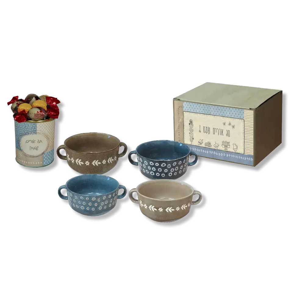 קערת קרמיקה קאנטרי עם עיצוב מרהיב, במילוי 5 פרלינים ו-5 מטבעות שוקולד, לצד פחית מתכת מעוצבת עם שוקולדים נוספים. מתנה לחנוכה שמשלבת טעם, איכות ופריט שנשאר לשימוש לאחר סיום הממתקים – מושלמת לכל גיל ואירוע.