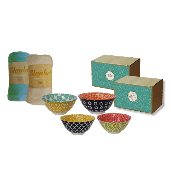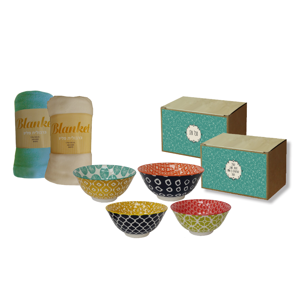 מארז יוקרתי הכולל קערת קרמיקה צבעונית בגודל 15.5×7 ס"מ ושמיכת פליז מפנקת בגודל 130×170 ס"מ.