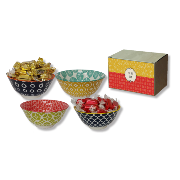מארז מיוחד לפסח הכולל קערת קרמיקה צבעונית בגודל 15.5×7 ס"מ ו-8 פרלינים איכותיים בטעמים משובחים. מתנה שמשלבת עיצוב מרהיב עם מתיקות חגיגית, מושלמת לשדרוג שולחן הפסח.