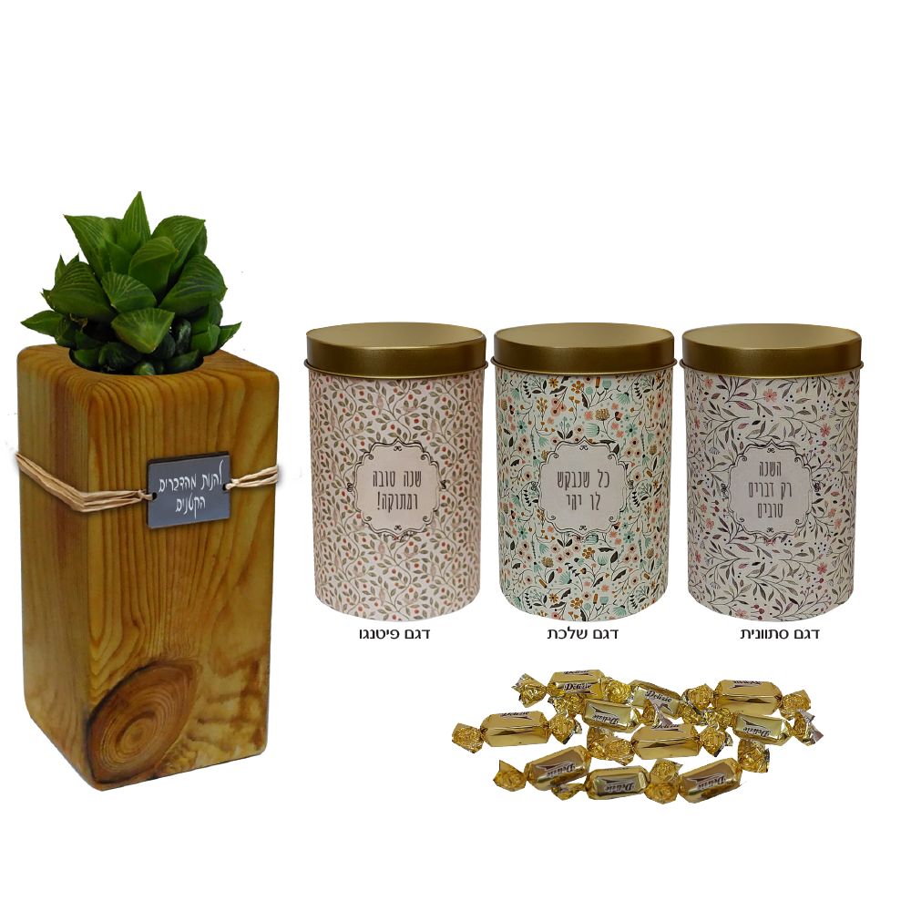 פחית פרלינים (12×7 ס"מ) יחד עם סקולנט בעציץ עץ מרובע. מגיע במבחר דגמים עם שילוב מרענן של מתוק וטבעי.