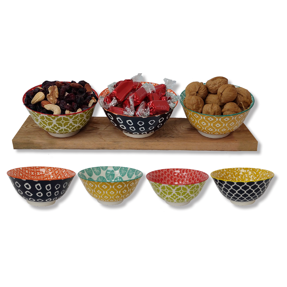 מארז עשיר הכולל 3 קערות קרמיקה צבעוניות בגודל 15.5×7 ס"מ, 8 פרלינים איכותיים, 8 אגוזים מובחרים, ו160 גרם מיקס בריאות. התכולה ארוזה בקפידה, מונחת על מצע קש חגיגי ומוכנה להענקה.