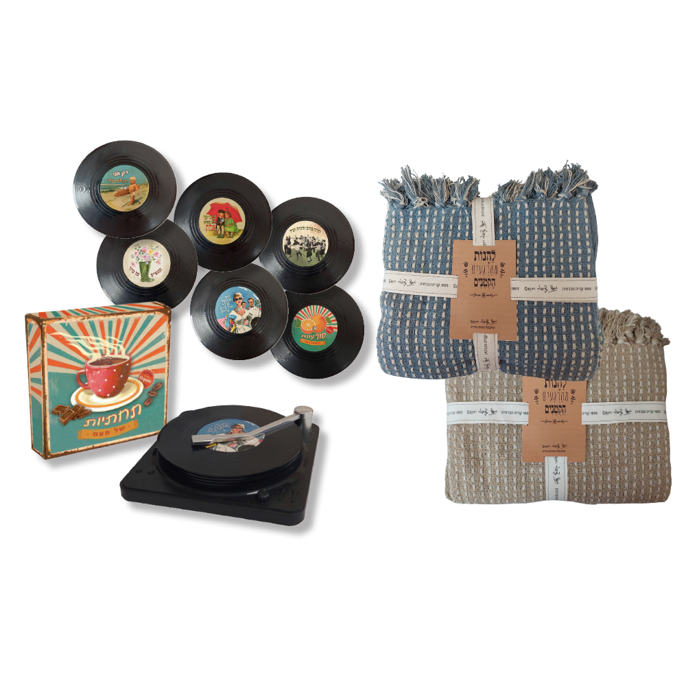 שי לעובדים מקורי ומלא נוסטלגיה – שמיכת כותנה נעימה בגודל 130×170 ס"מ יחד עם מארז מהודר של 6 תחתיות בעיצוב תקליטים ישראליים קלאסיים, בתוך קופסה מעוצבת בצורת פטיפון.