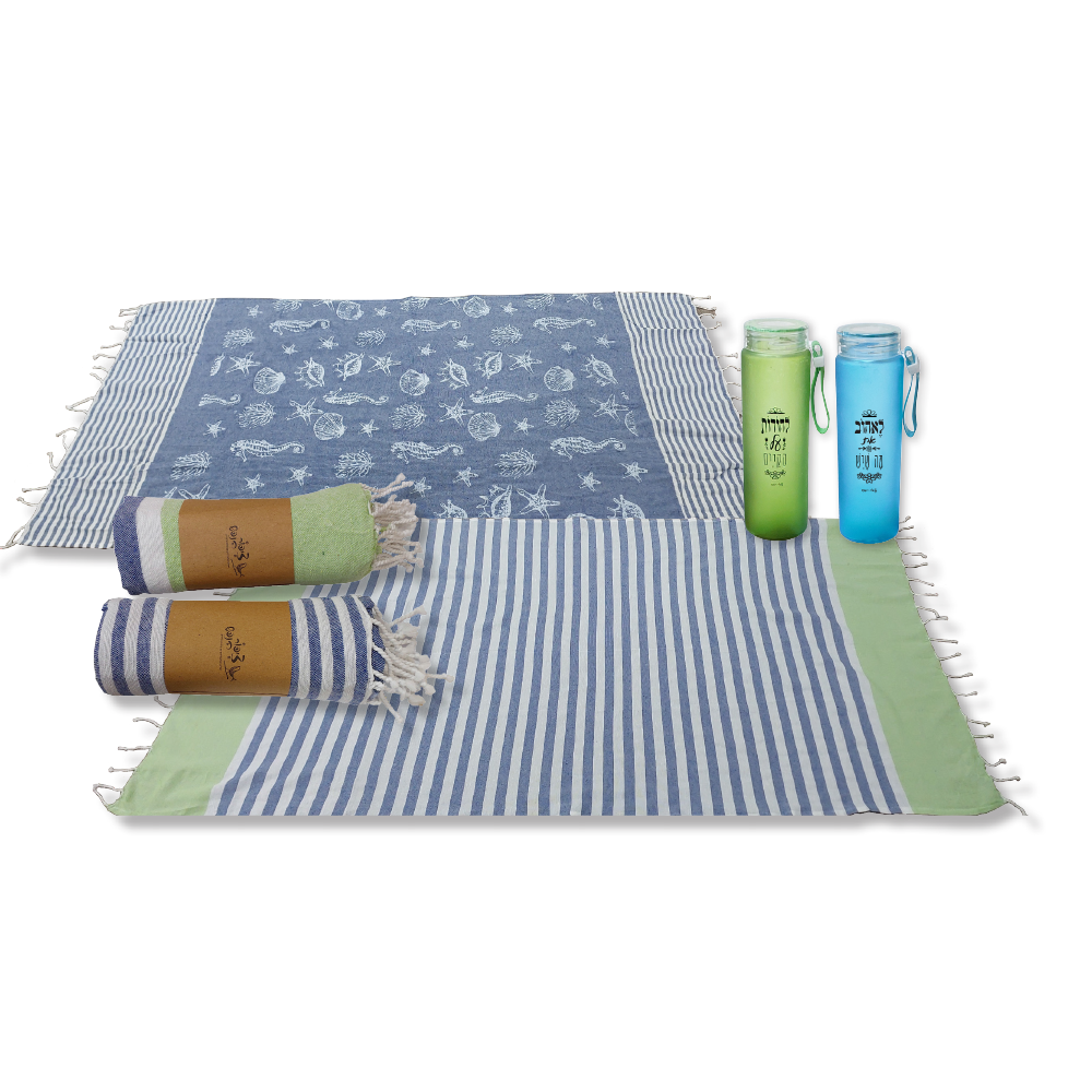 שמיכת חוף ובקבוק שתיה מעוצב מזכוכית גודל שמיכה 90 על 180 ס"מ, תכולת בקבוק 400 מל' הבקבוקים מגיעים במיקס צבעים לפי הקיים במלאי