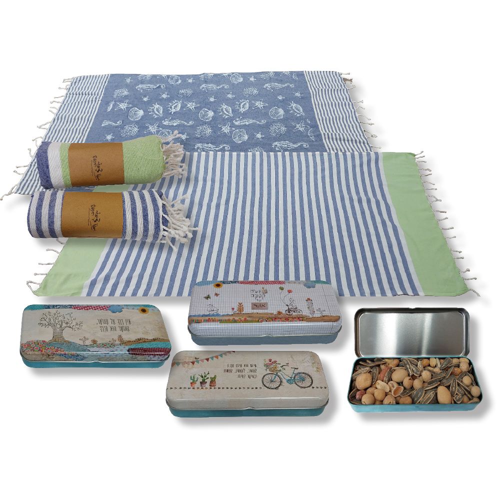 מארז מושלם לקיץ שכולל שמיכת חוף מפנקת וקלילה בעיצוב קלאסי, לצד קופסת פח ממולאת בפיצוחים מעורבים. מתנה ייחודית לעובדים או צוותים – קלילה, קיצית ושימושית לטיולים, חוף או מנוחה בגינה.
