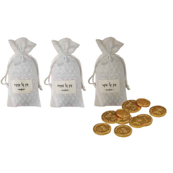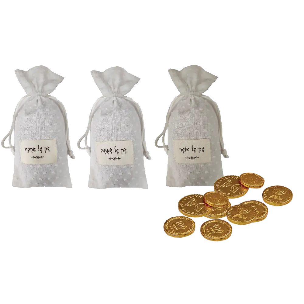 שקית כותנה בגודל 20×9 ס”מ, מלאה ב-10 מטבעות שוקולד חגיגיים, בעיצוב מסורתי.